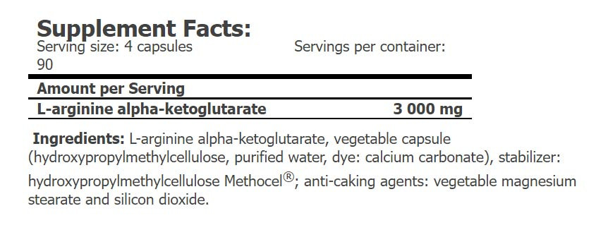 Az arginin-alfa-ketoglutarát az L-arginin aminosav fejlett formája. Fogyassz 2 kapszulát kb. 2 órával reggeli után és 2 kapszula kb. 30-60 perccel edzés előtt. Edzésmentes napokon fogyassz 2 kapszulát ebéd előtt és 2 kapszulát vacsora előtt. Ne használd ezt a terméket, ha terhes vagy vagy szoptatsz. A terméket nem gyermekek számára tervezték. Gyerekektől távol tartandó. Ne lépd túl az ajánlott napi adagot! Ennek az étrend-kiegészítőnek a fogyasztásával kapcsolatban konzultálj kezelőorvosoddal. Az étrend-kiegészítőket nem szabad a változatos étrend helyettesítésére használni. A gyártó nem vállal felelősséget a nem rendeltetésszerű használatból vagy tárolásból eredő károkért. Száraz, hűvös helyen, gyermekek elől elzárva tárolandó.