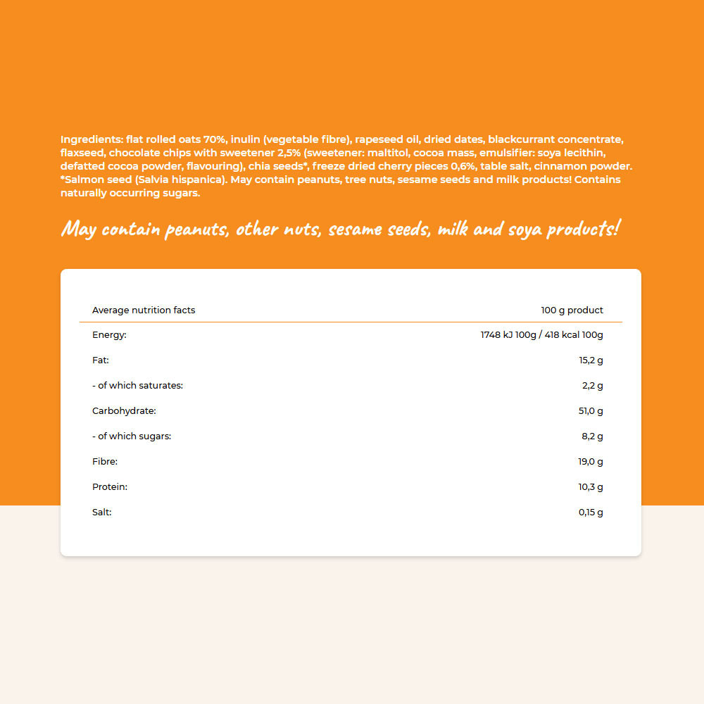 Összetevők: repceolaj, szárított datolya, fekete ribizli koncentrátum, lenmag, csokoládédarabok édesítőszerrel 2,5% (édesítőszer: maltit, kakaómassza, emulgeálószer: szójalecitin, zsírszegény kakaópor, aroma), chia mag (Salvia Hispanica), fagyasztva szárított meggy darabok 0,6%, só, őrölt fahéj. Tartalmazhat földimogyorót, dióféléket, szezámmagot és tejből készült terméket. Természetes módon előforduló cukrokat tartalmaz. Translated with DeepL.com (free version) Fogyaszd reggeli alapként vagy nassolnivalóként – ideális növényi tejjel, joghurttal vagy önmagában egy ropogós, csokis-meggyes élményért. Nyomokban földimogyorót, dióféléket, szezámmagot, tejet és szóját tartalmazhat. Természetes módon előforduló cukrokat tartalmaz. Tárold hűvös, száraz helyen, napfénytől védve, és a csomagoláson feltüntetett időpontig fogyaszd el.