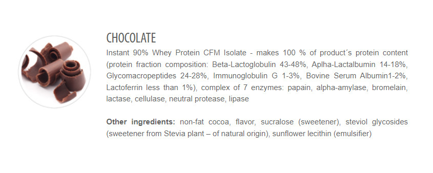 Az Iso 90 CFM Instant Whey előnye (a kiváló minőségű fehérjeforrás tartalom és a kiváló íz mellett) az alacsony zsír- és szénhidráttartalom, amit különösen a testzsír csökkentésére törekvő személyek értékelnek. Ennek a kiváló minőségű fehérjének a bevitele növelheti az izomtömeg növekedését és megakadályozhatja az izomkatabolizmus veszélyét.