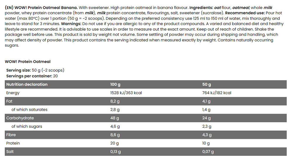 Nincs időd ételt készíteni? Egyszerű választást keresel egy ízletes és laktató reggelihez? Vagy esetleg nincs ötleted a desszertre? Bármi is legyen az ok, kipróbálhatod a WOW! Zabpelyhet - finom zabpehely magas fehérje tartalommal, amit kevesebb mint 5 perc alatt elkészíthetsz! A termék ideális választás mindenkinek, aki odafigyel a napi étrendjére, valamint minden sportoló számára. A kiadós adag szénhidrát biztosítani fogja a szükséges energiát, míg a fehérjék segítenek, hogy dolgozhass az álmaid alakján. A termék szukralózzal édesített, ami azt jelenti, hogy az összetevők nem tartalmaznak hozzáadott cukrot.