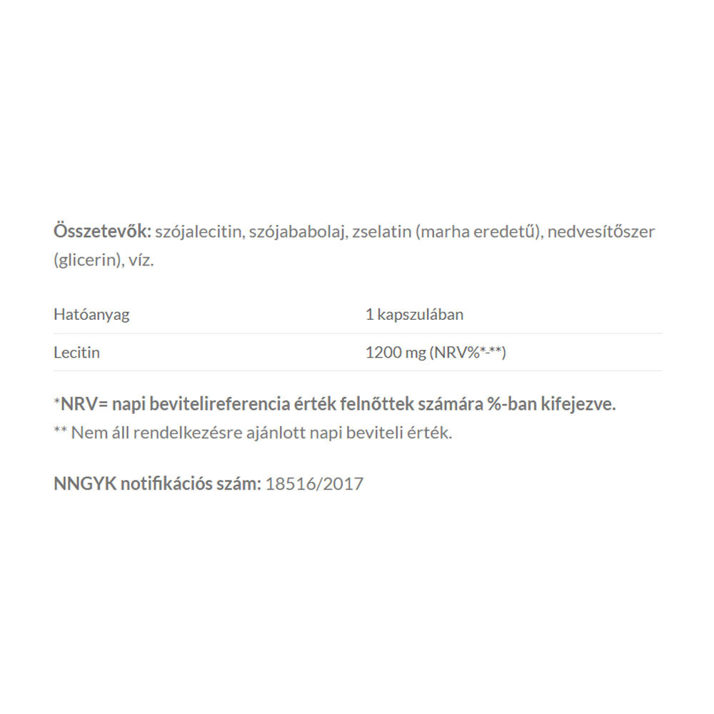 A lecitin mint természetes zsírszerű anyag az úgynevezett foszolipidek csoportjába tartozik. Poláros-apoláros felépítése miatta sejtfal fontos építőeleme. Különösen a csontvelő, az idegrendszer,a szív és a máj gezdeg lecitinekben. Fő forrása a szójaolaj. Napi 1 lágyzselatin kapszulát vízzel egészben lenyelni. Az ajánlott napi fogyasztási mennyiséget ne lépd túl! Az étrend-kiegészítő fogyasztása nem helyettesíti a kiegyensúlyozott, vegyes étrendet és az egészséges életmódot! Száraz, hűvös helyen, gyermekek elől elzárva tárolandó.