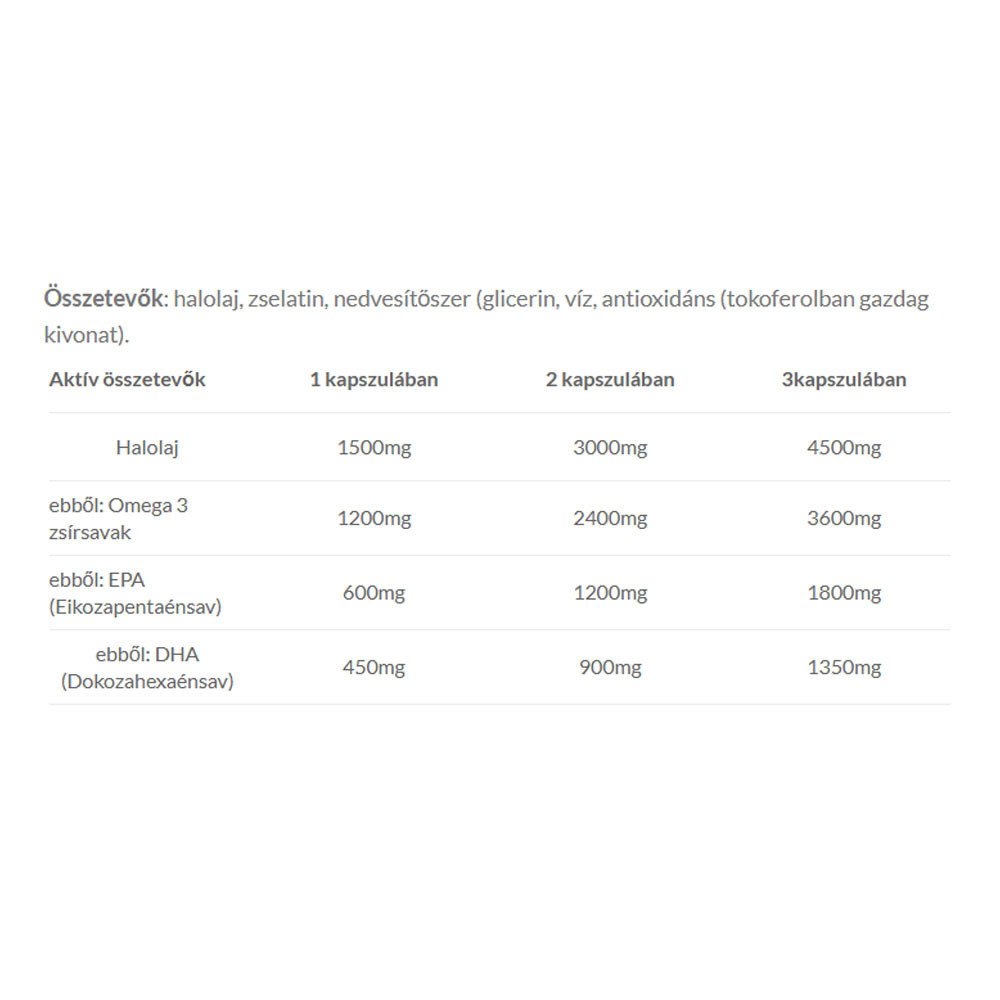 A termékben lévő halolaj természetes (TG) formában tartalmazza az omega-3 zsírsavakat. Az Eikozapentaénsav (EPA) és Dokozahexaénsav (DHA) hozzájárul a normál vérnyomás fenntartásához. A kedvező hatás 3g EPA és DHA napi bevitelével érhető el, mely a készítmény 3 kapszulájával biztosítható. Az EPA és DHA hozzájárul a szív megfelelő működéséhez. A kedvező hatás 250mg EPA és DHA napi bevitelével érhető el, mely a készítmény 1 kapszulájának elfogyasztásával biztosítható. A DHA hozzájárul a normál agyműködés és a normál látás fenntartásához. A kedvező hatás 250mg DHA napi bevitelével érhető el, mely a készítmény 1 kapszulájával biztosítható. Az EPA és DHA hozzájárul a vér normál trigliceridszintjének fenntartásához. A kedvező hatás 2g EPA és DHA napi bevitelével érhető el, mely a készítmény 2 kapszulájával biztosítható. A kiegészítésként fogyasztott EPA és DHA együttes napi mennyisége az 5 g-ot ne haladja meg.