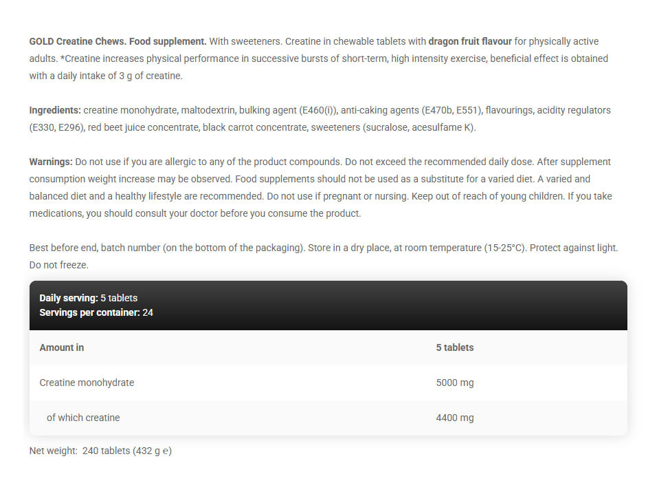 Kreatin rágótabletta sárkánygyümölcs ízesítéssel fizikailag aktív felnőttek számára. A kreatin növeli a fizikai teljesítményt rövid ideig tartó, nagy intenzitású, egymást követő, rövid ideig tartó, nagy intenzitású edzések során, a jótékony hatás napi 3 g kreatin bevitelével érhető el. Fogyassz 5 rágótablettát naponta.