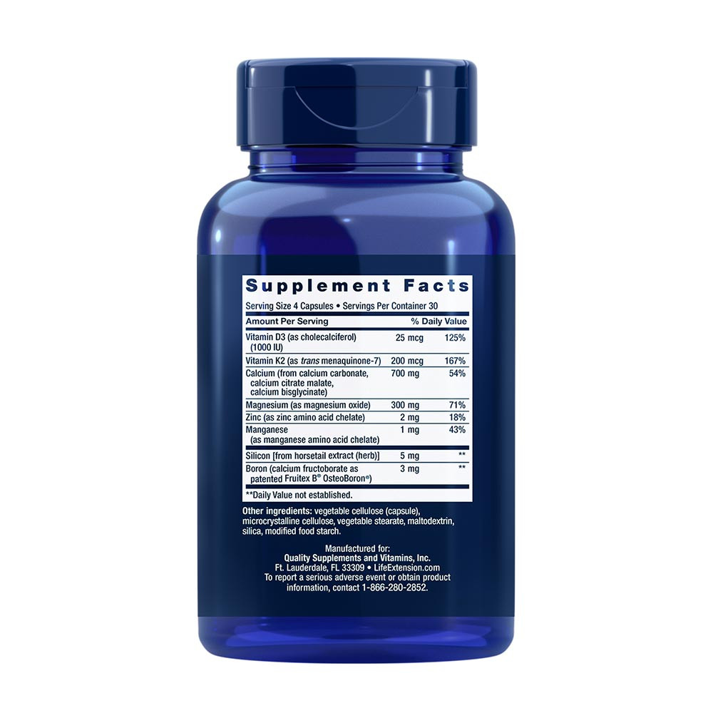 A magnéziumra az erős csontok fenntartásához van szükség. A Bone Restore K2-vitaminnal 300 mg magnéziumot tartalmaz magnézium-oxidból.A cink, a mangán és a szilícium elengedhetetlen az egészséges csontok fenntartásához. Ezekből az elemekből elegendő mennyiséget kell bevinni az egészséges csontképződés támogatásához.A bór a csontok és az ízületek szilárdságára jótékony hatással bíró nyomelem. Ez a formula szabadalmaztatott Fruitex B® OsteoBoron®-t tartalmaz, amely a gyümölcsökben és zöldségekben találhatóhoz hasonló kalcium/szénhidrát/bór komplexből készül.