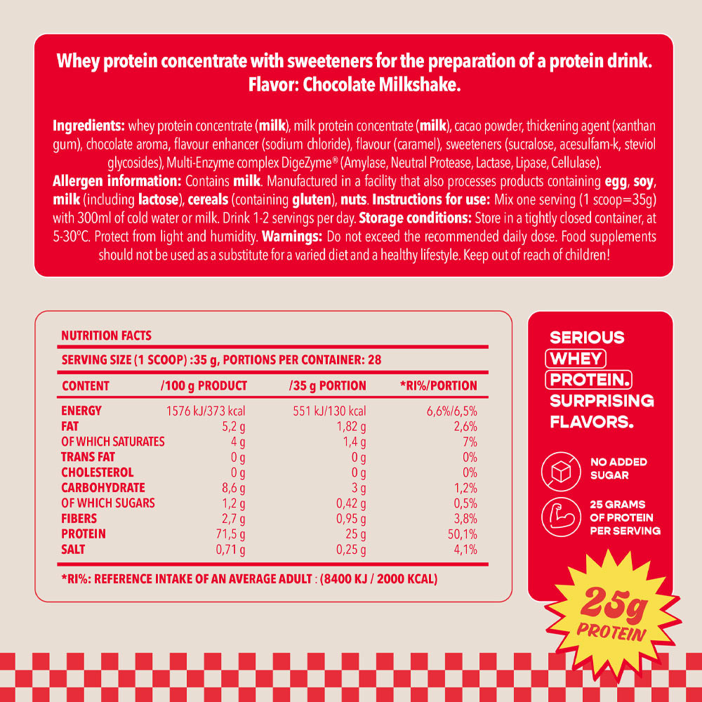 Mindegyik változat prémium minőségű fehérjét, hozzáadott cukor nélküli összetételt és felejthetetlen ízélményt nyújt, amely miatt minden shake-re örömmel számíthatsz. Keverj el 1 adagolókanál port (35 g) 250 ml vízben vagy tejben egy shakerben és rázd össze alaposan.