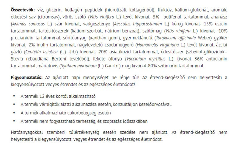 Gyógynövények és kollagén peptidek folyékony koncentrátuma, azok számára, akik támogatni szeretnék lábaik egészségét és azoknak, akik túlsúllyal, különösen körte típusú elhízással és/vagy narancsbőrrel küzdenek. Az összetevők fokozzák a vér és nyirokkeringést, erősítik a kötőszövetet, az erek falát és formálják a lábak vonalait. Segítenek csökkenteni a nehézláb érzést, támogatják a mikroerek cirkulációját, a vénák és kapillárisok egészséges működését és enyhítik a visszeres és hajszáleres panaszokat.