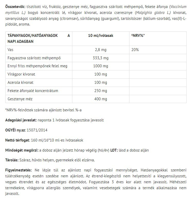 Fagyasztva szárított méhpempőt tartalmaz, ami 1000 mg friss méhpempőnek felel meg tasakonként! Mindezt dúsítottuk még virágporral, acerola cseresznye kivonattal, fekete áfonya lé koncentrátummal, vassal és gesztenye mézzel a lehető legjobb hatás elérése érdekében.