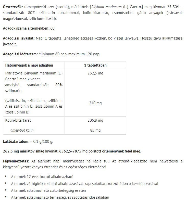 - azoknak, akik maximális mennyiségű (210 mg!) és magas koncentrációjú 80%-os szilimarin tartalmú máriatövismag kivonatot keresnek