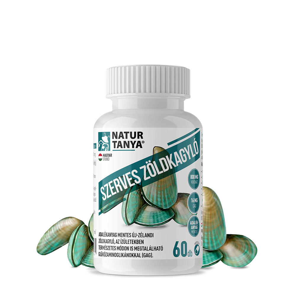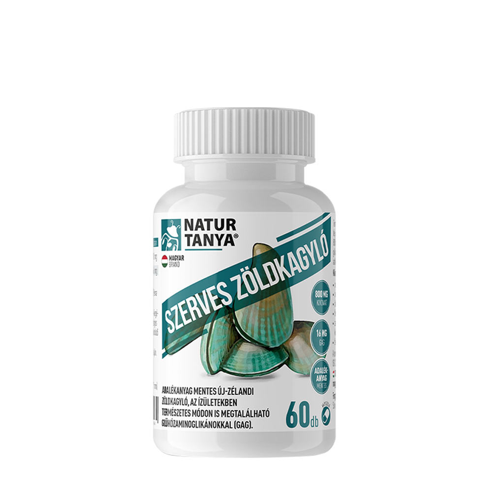Új-Zélandi zöldajkú kagyló (Perna canaliculus) teljes testéből készült, szerves minősítésű koncentrátum kapszulás formában. A zöldkagyló egyedülálló természetes forrása a glükózaminnak, kondroitinnak, omega-3 zsírsavaknak és egyedi glikozaminoglikánoknak (GAG) – mindegyik összetevő a porcok, ízületek és kötőszövetek táplálásában vesz részt. A Natur Tanya szerves minősítése garantálja a szennyeződésmentes, természetes eredetet.