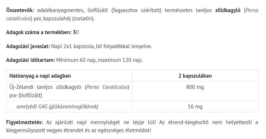 Fontos: Ez a termék étrend-kiegészítő. Nem helyettesíti a változatos étrendet és az egészséges életmódot. Kagylóallergia esetén ne szedd. Terhesség, szoptatás vagy gyógyszerszedés esetén orvosi konzultáció szükséges.