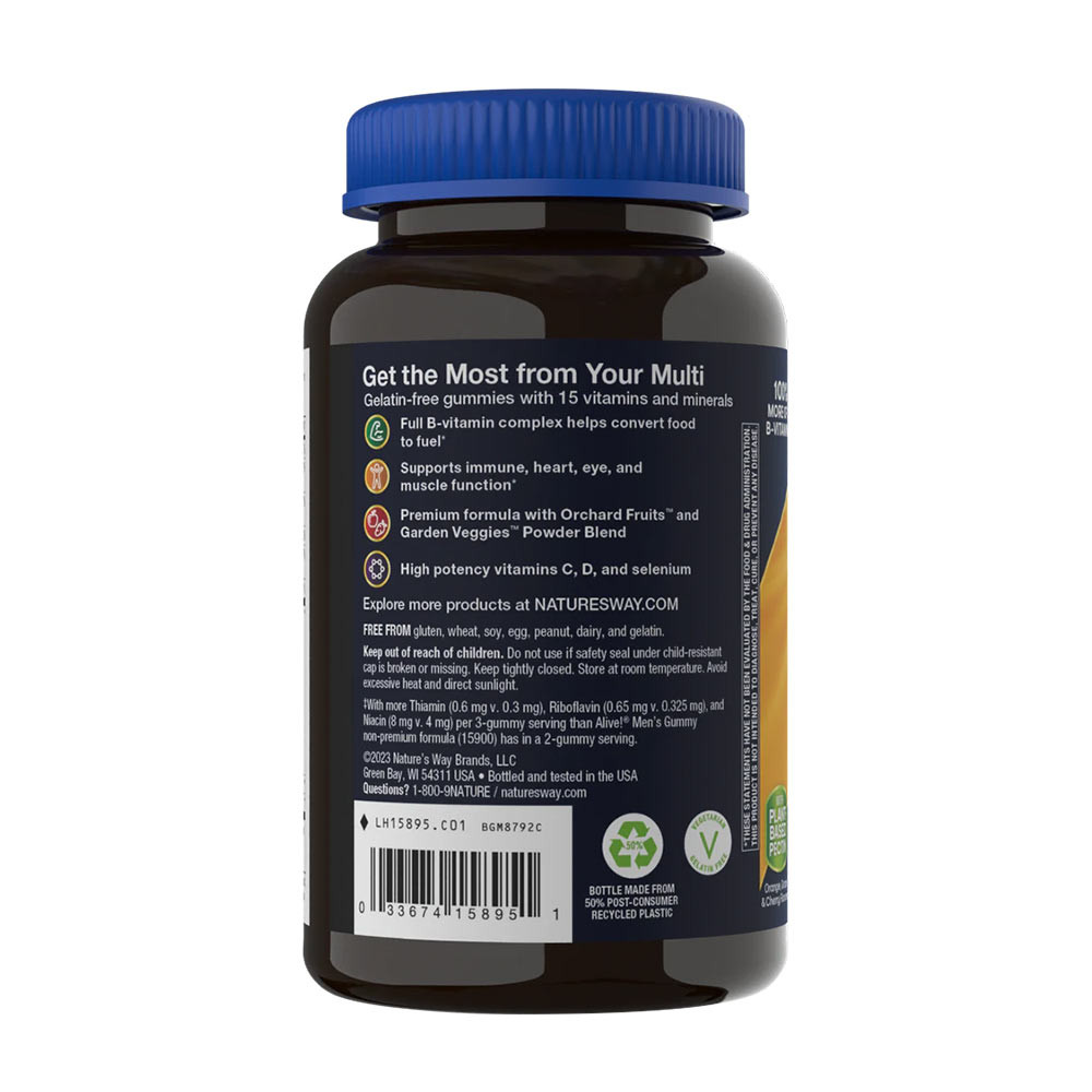 Szeretnél megfelelni a napod követelményeinek, és megragadni a fontos pillanatokat, ezért próbáld ki ezeket az egyszerű, kényelmes gumicukrokat, hogy segítsenek neked mindebben. Alive! Premium Men's Gummy Multivitaminok 15 vitamint és ásványi anyagot tartalmaznak, beleértve a teljes B-vitamin komplexet, hogy segítsen a táplálékot sejtenergiává alakítani. Egy napi adag támogatja a szív egészségét, a szem egészségét, az izomműködést és az immunrendszer egészségét. Legyen a rutin része, akárcsak a reggeli kávé, és érezd magad a legjobb formában minden nap.