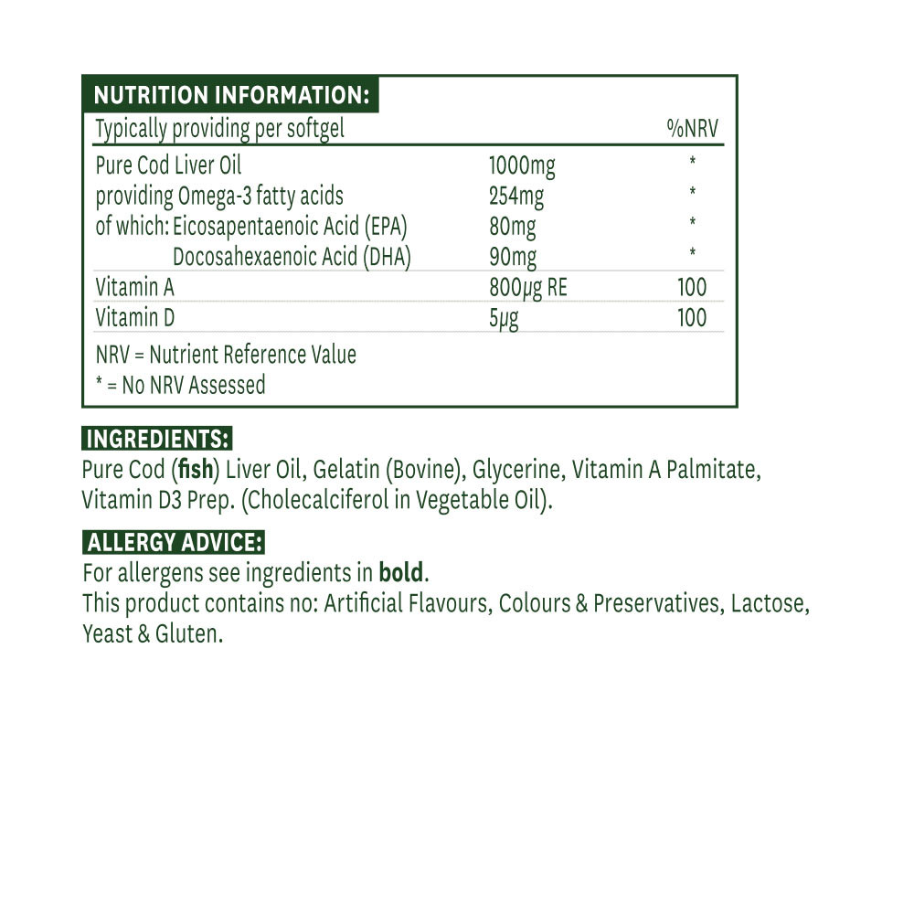 A Natures Aid nagy erősségű, 1000 mg-os csukamájolaj kapszuláinak mindegyike A-vitamin,D-vitamin és omega-3 zsírsavak forrása, beleértve a DHA-t és az EPA-t.