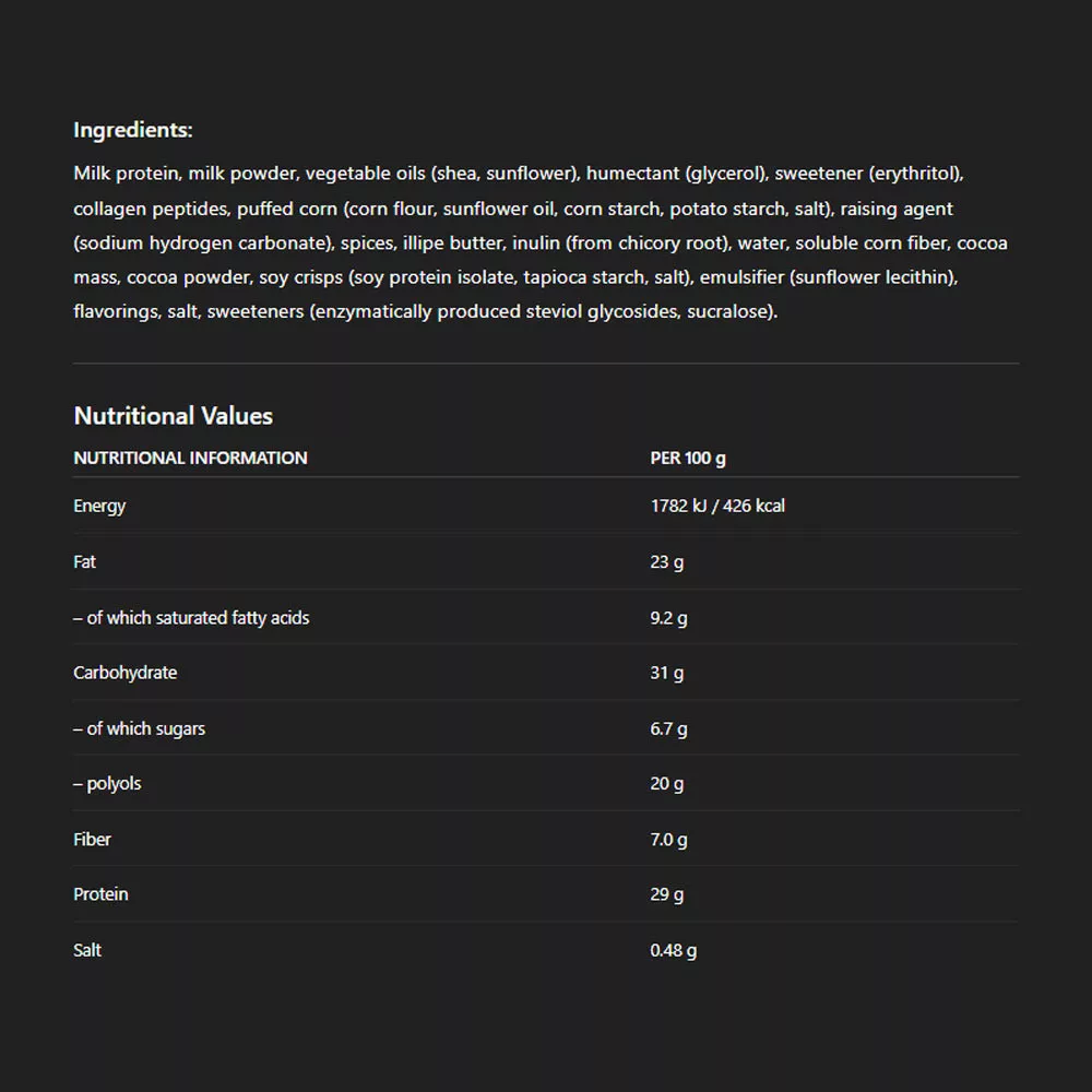 Tökéletes választás edzés után vagy nasiként a rohanós napokon – 4 g nettó szénhidráttal! Fogyaszd köztes étkezésként, edzés előtt vagy amikor gyors, egészséges nassolnivalóra van szükséged. Allergéneket tartalmazhat (pl. zab, diófélék). Kisgyermekektől elzárva tartandó. A kiegyensúlyozott étrend és egészséges életmód részeként fogyaszd. Száraz, hűvös helyen tárold, közvetlen napfénytől védve.