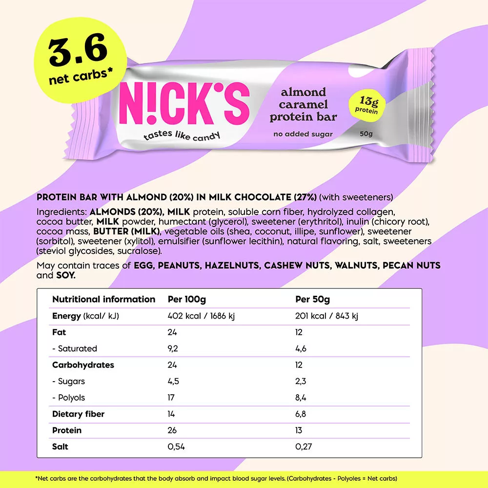 Nick’s Mandulás-karamellás proteinszelet 26%-os fehérjetartalommal. A mandula és a karamella egy tökéletes párosítás, feledhetetlen élmény minden harapásnál. A fehérjeszelet nem tartalmaz hozzáadott cukrot, édesítőszerekkel készült. Gluténmentes finomság. Fogyaszd két étkezés között, edzés után vagy amikor egy sós-édes, fehérjedús finomságra vágysz. Gyermekektől elzárva tartandó. Túlzott fogyasztása hashajtó hatású lehet. Mandulát, tejet, szóját és más dióféléket tartalmazhat, allergiások számára nem ajánlott. Száraz, hűvös helyen, napfénytől védve tárolandó. Ne tedd ki hőhatásnak.