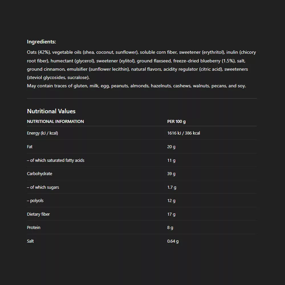 Fogyaszd köztes étkezésként, edzés előtt vagy amikor gyors, egészséges nassolnivalóra van szükséged. Allergéneket tartalmazhat (pl. zab, diófélék). Kisgyermekektől elzárva tartandó. A kiegyensúlyozott étrend és egészséges életmód részeként fogyaszd. Száraz, hűvös helyen tárold, közvetlen napfénytől védve.