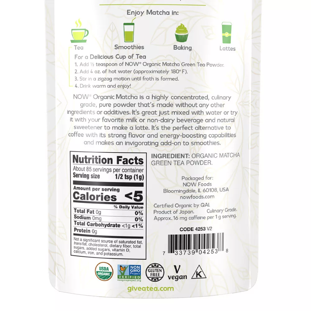 A NOW® Bio Matcha egy rendkívül koncentrált, konyhai felhasználásra is alkalmas, tiszta por, amely nem tartalmaz semmilyen más összetevőt vagy adalékanyagot. Kiválóan fogyasztható önmagában, vízzel keverve, vagy próbáld ki kedvenc (növényi) tejeddel és természetes édesítővel, lattéként. Erőteljes íze és energizáló hatása révén tökéletes alternatívája lehet a kávénak, és frissítő kiegészítője a turmixoknak. Élvezd a matchát teaként, turmixban, sütéshez vagy lattéként!