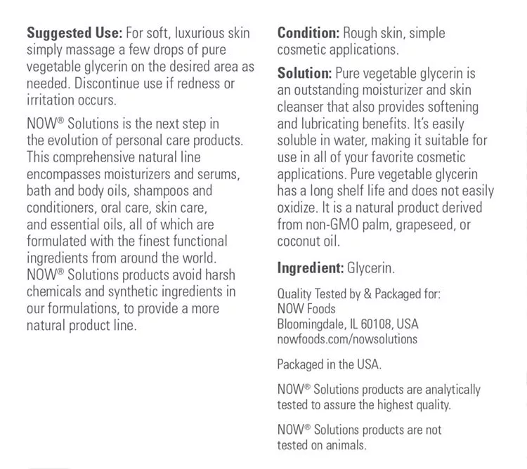 ▸ MI EZ A TERMÉK?A NOW Foods Vegetable Glycerine 473 ml-es gazdaságos kiszerelése a 100%-os növényi glicer innek. Erőteljes nedvességmegkötő alapanyag bőrápoláshoz, hajápoláshoz és természetes szappan- és kozmetikumkészítéshez. Hígítva alkalmazva mélyen hidratál.