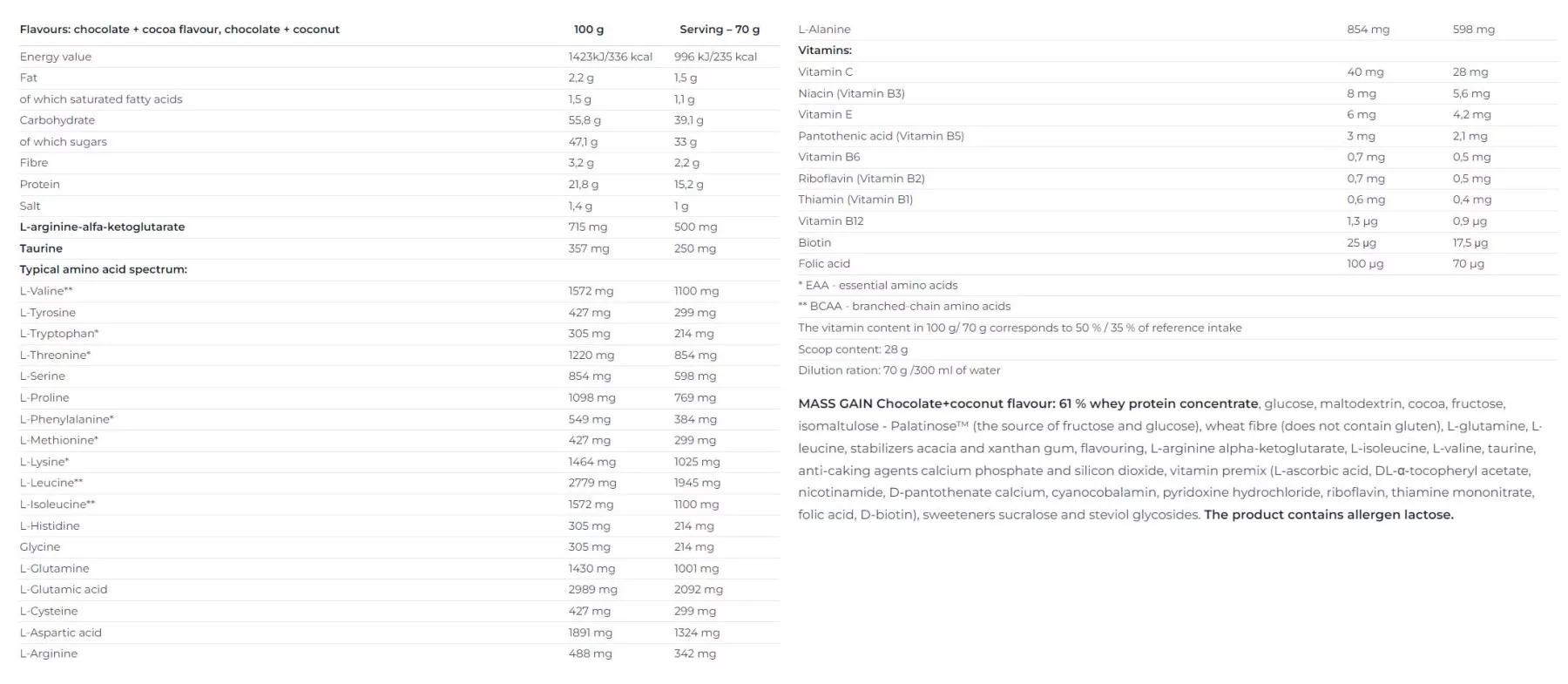 Nutrend MASS GAIN harmadik generációs tömegnövelő egy tejsavóproteinen alapuló, alacsony kalóriatartalmú sejttérfogat és izomtömeg-növelő termék, válogatott fehérje forrásból (20%) és összetett szénhidrát tartalommal. A komplex szénhidrátokat különféle szénhidrátok, maltodextrin, glükóz és fruktóz alkotják. Összetétele miatt bátran lehet bármilyen sportolónak ajánlani, aki gyors és minőségi izomtömeget szeretne elérni rövid időn belül.