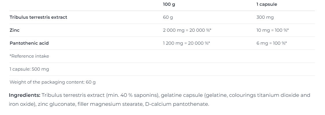 A Tribulus Terrestris növény kivonata - melyet "természetes viagra" néven ismernek, a magas szaponin tartalmának köszönhetően emeli a tesztoszteron szintet. Nem csupán a libidó emelésére alkalmas, de javítja a hangulatot és növeli az önbizalmat is. A TRIBULUS TERRESTRIS azért is annyira kedvelt, mert a tesztoszteron szint emelésen túl gyorsítja az anyagcserét is. Növeli az izomtömeget, az erőszintet, az állóképességet, fokozza a szellemi és fizikai regenerációt. A TRIBULUS TERRESTRIS ezentúl csökkenti a testzsír százalékot és a koleszterin szintet, méregteleníti a májat és a vizelési problémákat is megoldja.