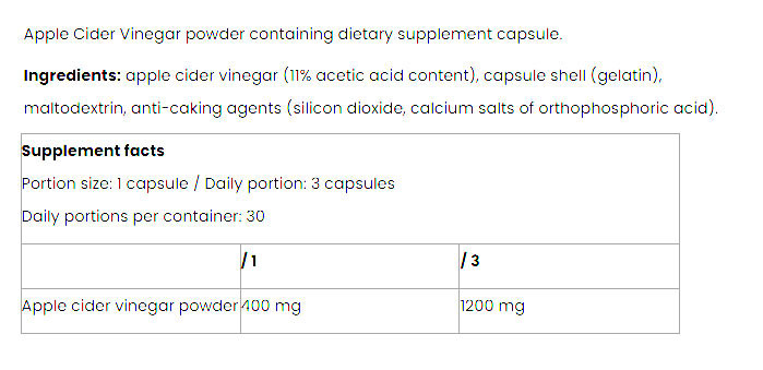 Tiszta, 100% almaecetpor-tartalmú, diétát támogató hatóanyag kapszulás formában.