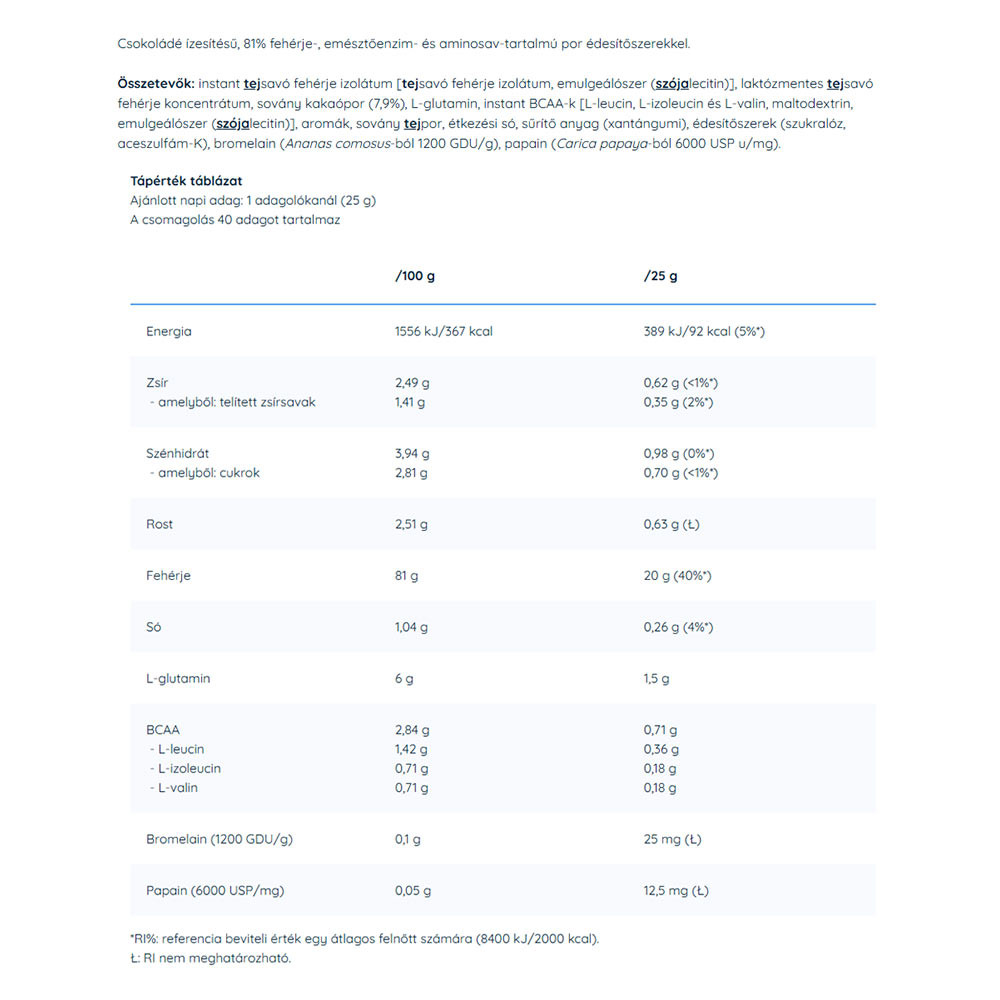 Egy adagjában (25 g) 22 gramm gyors felszívódású, minőségi tejsavófehérje-izolátum található!