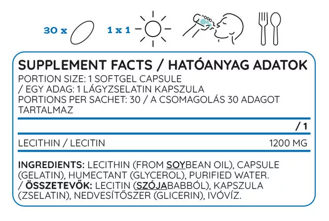 A Nutriversum Lecitin 30 Lágykapszula egy kompakt, 30 adagos lecitinkészítmény, amely szójababból kivont természetes lecitint tartalmaz - 1200 mg-ot adagonként. A lecitin foszfolipidek gazdag forrása: támogatja a máj egészségét, az idegrendszert és a koleszterinszint kezelését. Ez a kiszerelés ideális azoknak, akik először próbálják a lecitint, vagy utazáshoz praktikus csomagolást keresnek.