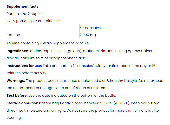 Mivel a mindennapi étrendünkben nem sok olyan élelmiszer található, amelyek természetes módon magas taurin tartalmúak (mint a tojás, halak, tejtermékek), ami az aktív életmódot folytató egyének számára elegendő lenne, általában kiegészítésként étrend-kiegészítők használatát javasoljuk.