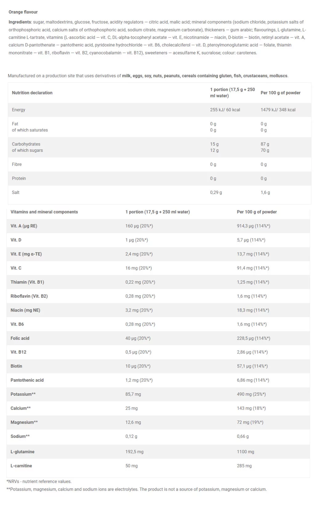 Napi 1 adag az edzés ideje alatt. Oldj fel 1 adagot (17,5 g por = 1½ kanál) 250 ml vízben; használj shakert legalább 10 másodpercig. Ne lépd túl az ajánlott napi adagot. Az étrend-kiegészítőket nem szabad a változatos és kiegyensúlyozott étrend helyettesítésére használni. Száraz, hűvös helyen, gyermekek elől elzárva tárolandó.