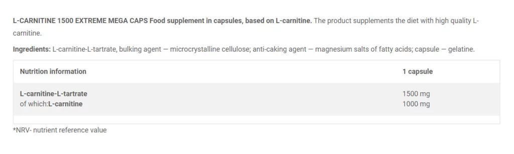 - 1500 mg L-karnitin tartarát formájában 1 Mega Caps kapszulában