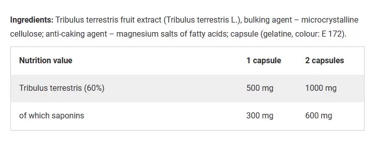 A termék a puncturevine (Tribulus terrestris L.) porított vizes kivonatát tartalmazza. A Tribulus terrestris segít a test, az izomtónus és az energiaszint fenntartásában. Továbbá segít fenntartani a légzőrendszer egészségét, támogatja a fájdalommal szembeni ellenállást, valamint elősegíti a szexuális vágyat és a szexuális kapacitást. A terméket a fizikailag aktív emberek és sportolók számára tervezték, akik a fizikai és szexuális teljesítőképesség javítására, valamint a test általános megerősítésére törekszenek.