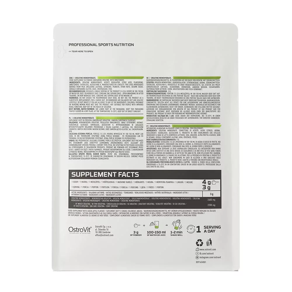 Az OstroVit kreatin-monohidrátot használ, azaz a kreatin molekula és a vízmolekula egy molekulává történő kombinációját - mivel a kreatin hidrofil vegyület, ezért gond nélkül egyesül a vízzel, így olyan anyag, amelyet kiváló asszimilálhatóság jellemez. A kreatin-monohidrát a kreatin legegyszerűbb szerkezeti formája, ugyanakkor a sportolók körében a legnépszerűbb vegyület - Kezdők és profik számára egyaránt tökéletes, ami annak köszönhető, hogy a kreatin növeli a fizikai teljesítményt egymást követő, rövid, nagyon intenzív fizikai gyakorlatok esetén, és a jótékony hatás napi 3 g kreatin fogyasztásakor jelentkezik.