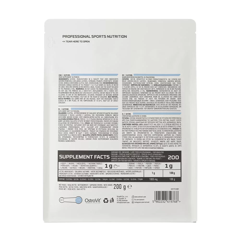 Az OstroVit Glycine Supreme Pure 200 g prémium, csúcsminőségű tiszta L-glicin por - egyetlen hatóanyag, semmi más. A glicin a kollagén domináns aminosava és az idegrendszer egyik legfontosabb gátló neurotranszmittere. Javítja az alvást, csökkenti az esti agyi pörgetést, segíti a kollagénszintézist és mérsékli a hőmérséklet-szabályozás zavarát alvás közben. Az "édes" por könnyen elkeverhető mindenféle italba vagy ételbe.