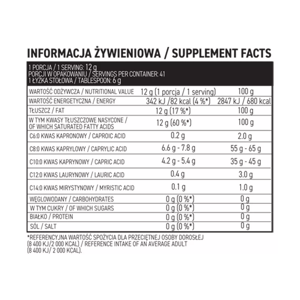 - Közepes láncú zsírsavak MCT (közepes láncú trigliceridek) forrása - Az étrend-kiegészítő egy adagja 12 g zsírt tartalmaz, beleértve a kaprikus vagy kaprilsavat is.