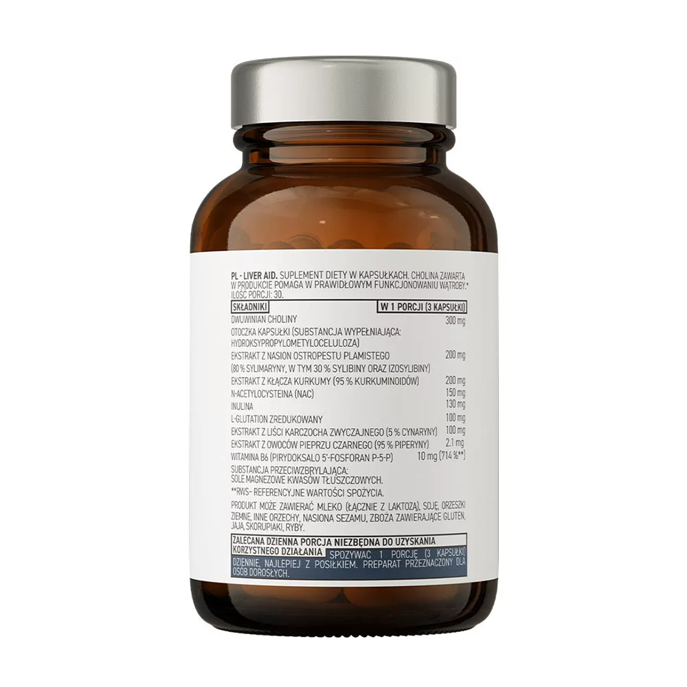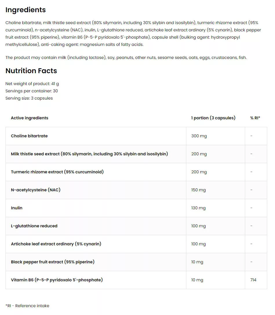Máriatövismag-kivonat - 80% szilimarinra standardizált máriatövis, beleértve 30% szilibint és izoszilibint, amely a máj működését javító jótékony tulajdonságairól ismert. Védi a gyomornyálkahártyát, támogatja a méregtelenítő funkciókat és védi a májsejteket vagy hepatocitákat, amelyek különösen ki vannak téve a NSAID-ok, az alkoholfogyasztás és más toxinok szedése esetén.