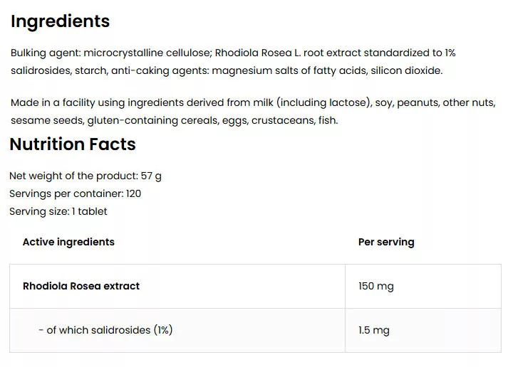 - A rhodiola rosea kivonat forrása - az étrend-kiegészítő egy adagja 150 mg 1% szalidrozidokra standardizált rhodiola rosea kivonatot biztosít a szervezet számára.