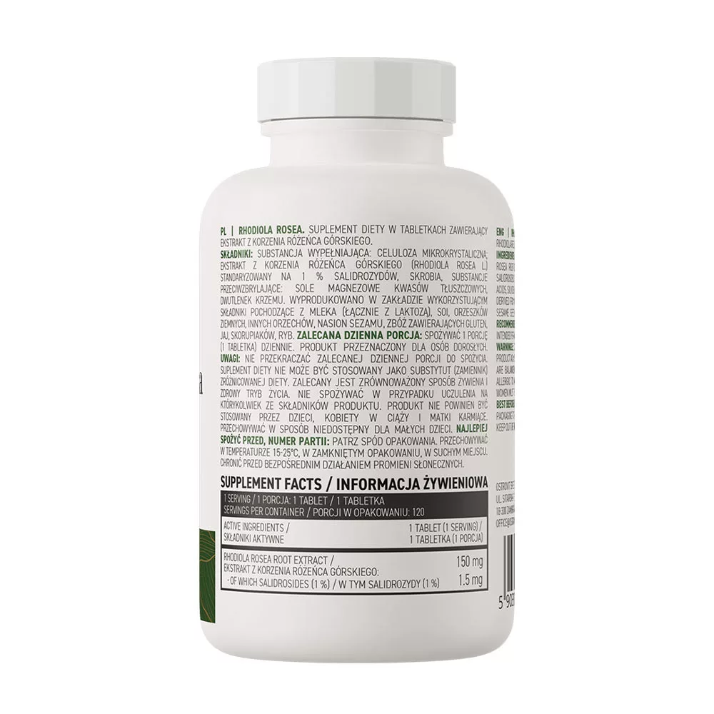 Rhodiola Rosea kivonat - Rhodiola Rosea L. - a Crassulaceae családba tartozó, sarki gyökérként is ismert növény gyökeréből nyert kivonat. A hagyományos gyógyászatban már évszázadok óta használt anyag, amelyet adaptogénnek tartanak. A Rhodiola rosea gyökér értékes anyagok forrásaként emelkedik ki, és a termékben található egyik kulcsfontosságú vegyület a szalidrozidok, amelyek tartalma standardizált az OstroVit készítményben használt növényi kivonatban, ami pozitív hatással van az étrend-kiegészítő minőségére. Fogyassz naponta 1 adagot (1 tabletta). A termék felnőttek számára készült. Ne lépd túl a fogyasztásra ajánlott napi adagot. Az étrend-kiegészítő nem használható a változatos étrend helyettesítésére. Kiegyensúlyozott étrend és egészséges életmód ajánlott. Ne fogyaszd, ha allergiás vagy a termék bármely összetevőjére. A terméket gyermekek, terhes nők és szoptatós anyák nem használhatják. Kisgyermekek elől elzárva tartandó. 15-25°C-on, zárt tartályban, száraz helyen tárold. Védd a közvetlen napfénytől.