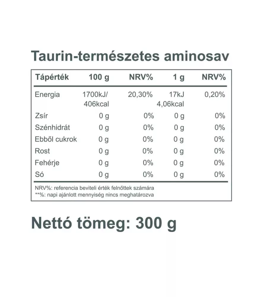 A Vitaking Taurin Italpor (Natúr) 300 grammos, ízesítetlen taurin-aminosav por, amelyet vízbe keverve könnyen fogyasztható. A taurin az agyban és az idegrendszerben természetesen nagy koncentrációban előforduló aminosav, amely gátló neurotranszmitter-szerű hatást fejt ki: aktiválja a GABA-receptorokat, csökkenti az idegsejtek ingerlékenységét és elősegíti a pihentető alvást. Az idősödéssel a szervezet taurinszintje csökken. A taurin emellett erős antioxidáns, védi a szív izomzatát és a retinát, és az energiaitalok egyik legismertebb összetevője – nem azért, mert stimuláns, hanem mert az energia-anyagcsere és az elektrolit-egyensúly szempontjából fontos.