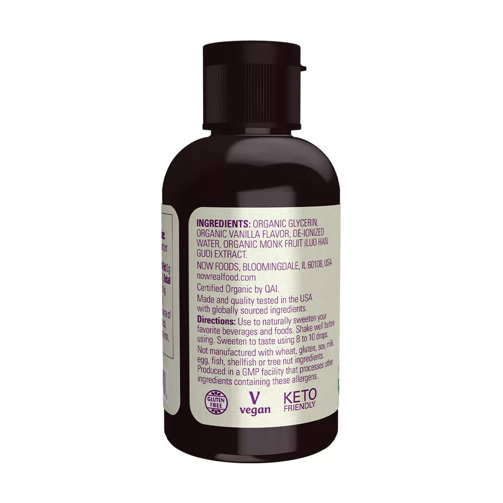 Összetevők (Vanília): Deionizált víz, tanúsított organikus szerzetesgyümölcs (Luo Han Guo) kivonat, 11% organikus nádalkohol. Adagolásonkénti mennyiség: 0 kalória, összes zsír 0 g (0% DV), 0 mg nátrium (0% DV), összes szénhidrát. Og (0% DV), összes cukor 0g (beleértve 0g hozzáadott cukrot, 0% DV), fehérje 0g. Nincs jelentős telített zsír, transz-zsír, koleszterin, élelmi rost, D-vitamin, kalcium, vas és kálium forrása.