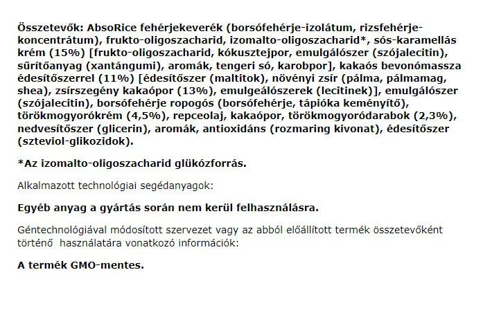 Amennyiben alacsony cukortartalmú édességre vágysz: az Abso LAYERED bar cukor hozzáadása nélkül készül, e mellett fontosnak tarjuk a megfelelő protein mennyiség biztosítását is: egy szelet 12 g proteint tartalmaz. Nem elhanyagolható a magas rosttartalom sem, amely segíti az emésztést és jótékony hatással van a szervezetre. Egy szelet Abso LAYERED bar a napi minimum rostbevitel** közel 1/2-ét tartalmazza.