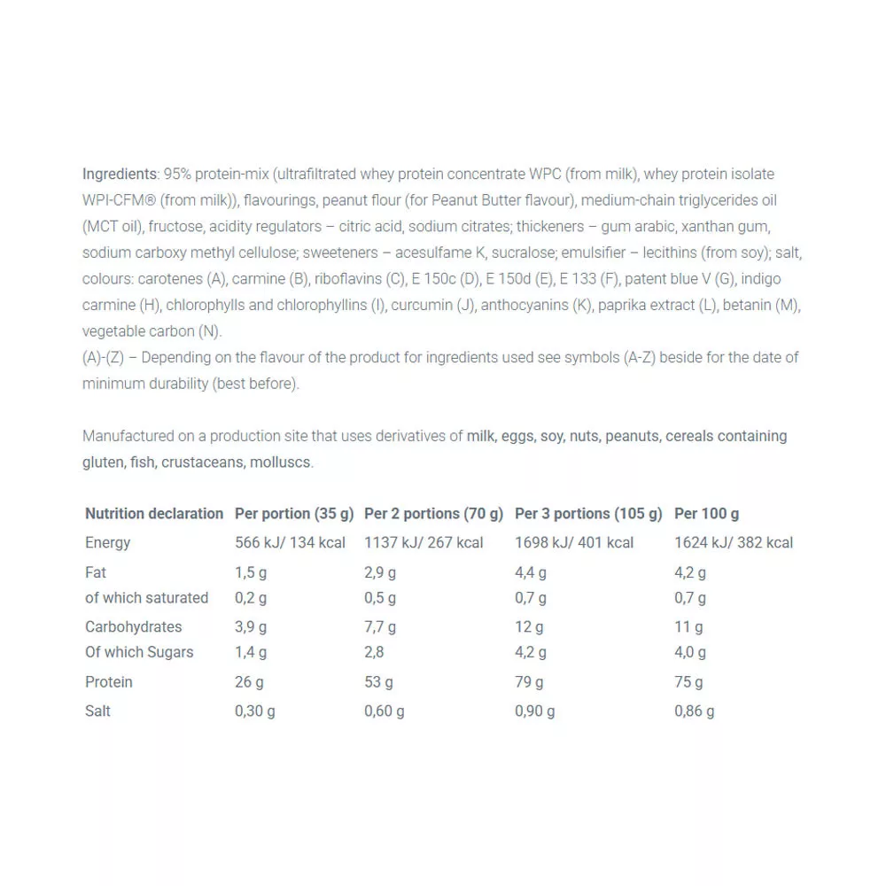 WHEY PROTEIN COMPLEX 100% – étrend-kiegészítő. Cukrot és édesítőszereket tartalmaz. Ízesített termék. Magas fehérjetartalmú por koncentrátum. Kiváló minőségű ultraszűrt tejsavófehérje-koncentrátum és tejsavófehérje-izolátum keveréke. A termék fizikailag aktív személyek és sportolók számára készült, akik izomtömegük fejlesztésére törekednek. A fehérje hozzájárul az izomtömeg növekedéséhez és fenntartásához. Fogyassz napi 1–3 adagot – reggeli előtt, étkezések között, edzés után vagy lefekvés előtt. Keverj össze 1 adagot (35 g = 1 tasak) 150 ml vízzel. Elkészítés után azonnal fogyaszd. Cukorbetegek számára nem ajánlott. Ne lépd túl az ajánlott napi adagot. Az étrend-kiegészítő nem helyettesíti a változatos és kiegyensúlyozott étrendet. A változatos étrend és az egészséges életmód ajánlott. Gyermekektől elzárva tartandó. Felbontatlanul, száraz és hűvös helyen tárolandó.