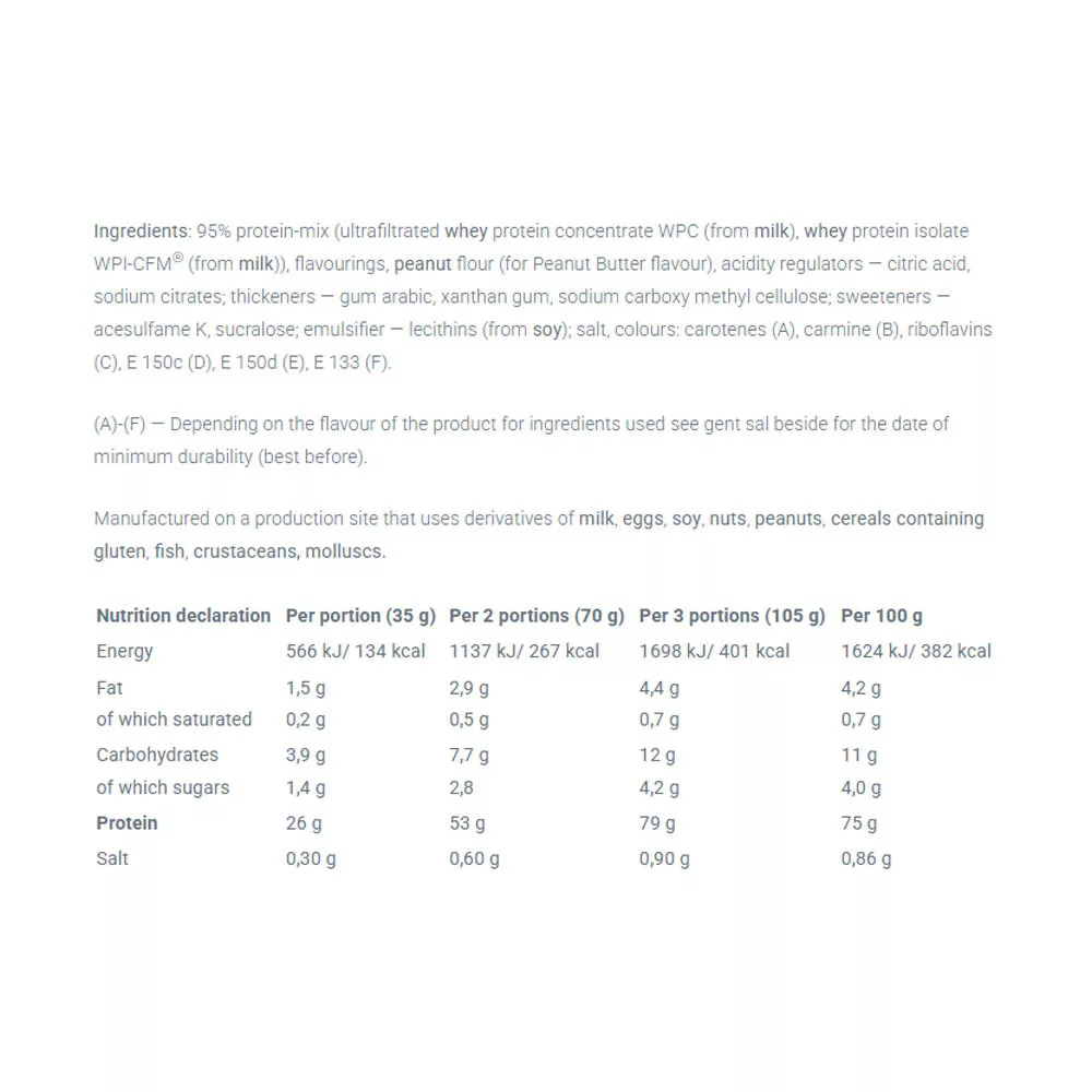 Étrend-kiegészítő. Magas fehérjetartalmú por. Édesítőszerekkel. Kiváló minőségű, ultraszűrt tejsavófehérje-koncentrátum és tejsavófehérje-izolátum keveréke. A termék fizikailag aktív emberek és sportolók számára készült, akik az izomtömeg növelésére törekszenek. Fogyassz napi 1–3 adagot — reggeli előtt, étkezések között, edzés után vagy lefekvés előtt. Oldj fel 1 adagot (35 g por = 1 adagolókanál) 150 ml vízben; használj shakert legalább 10 másodpercig. Elkészítés után azonnal fogyaszd. Ne lépd túl az ajánlott napi adagot. Az étrend-kiegészítők nem helyettesítik a változatos és kiegyensúlyozott étrendet. A változatos étrend és az egészséges életmód ajánlott. Gyermekektől elzárva tartandó. Gyermekektől elzárva tartandó. Felbontatlanul, száraz és hűvös helyen tárolandó.